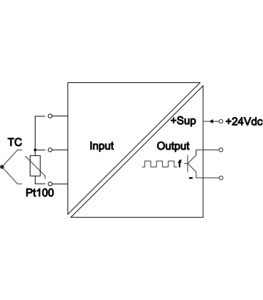 - Input circuit galvanically separated from output and power supply circuits. Common ""-" terminal for output and power supply circuits.