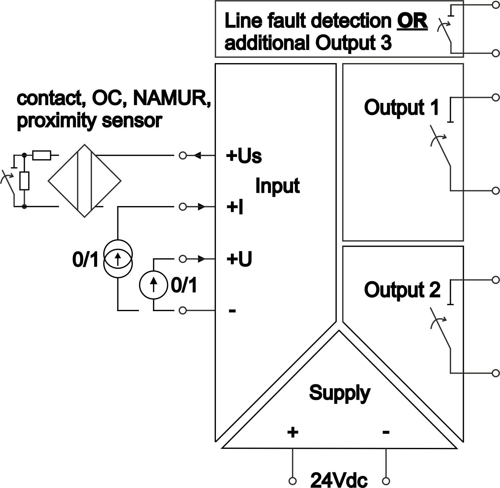 - Alarm indication of shorted- or opened-circuit in the input line (opto-relay for two outputs, only LED for three-outputs).