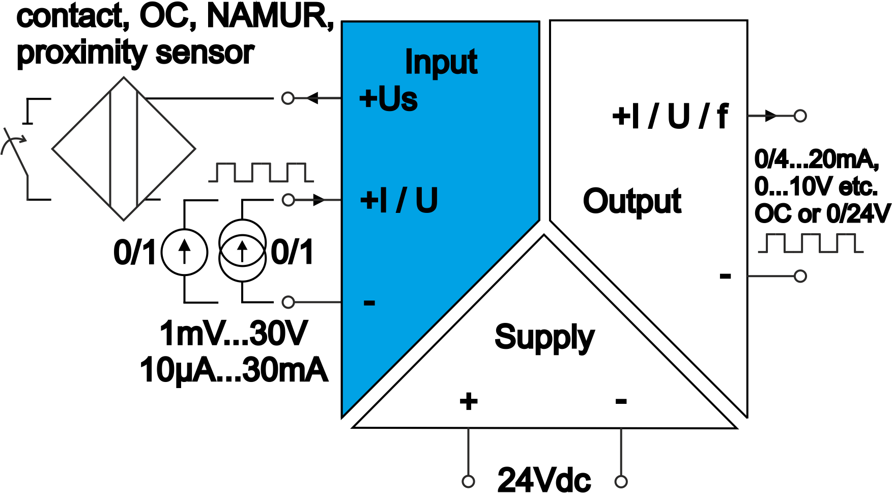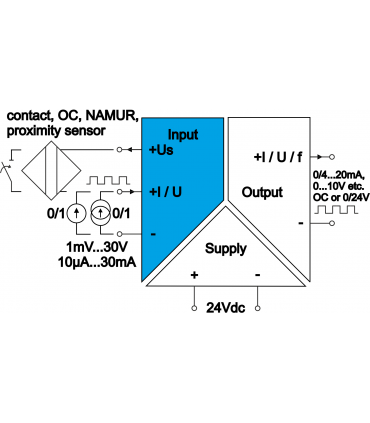 • Any standard signal as ordered (0...10V, 0/4...20mA etc.) proportional to input frequency.