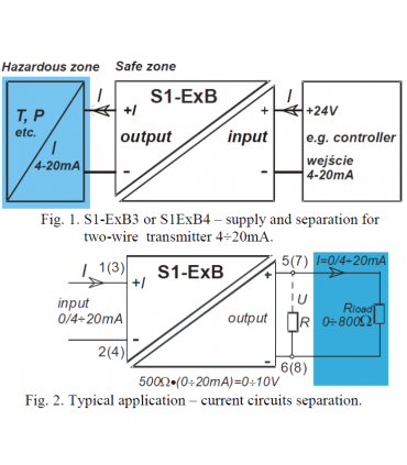 Current 4...20mA separator, operation of a two-wire transmitter installed in hazardous zone with a controller with active input, without additional power supply, with intrinsically safe barrier Ex Atex