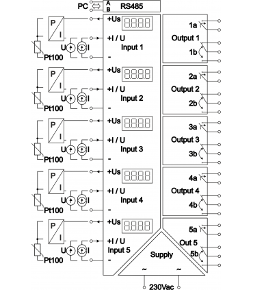 - 5 analog inputs: voltage, current, Pt100, potentiometer, two-wire transmitter.