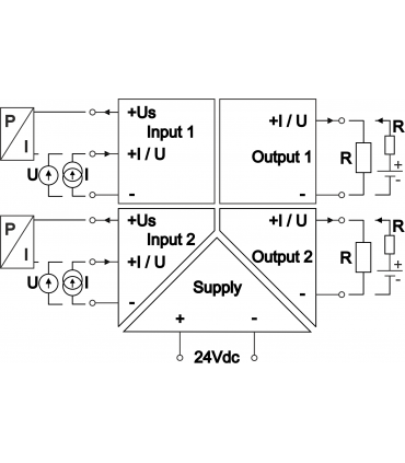 Supplier-separator for two-wire transmitters to any analog signal, 2 channels