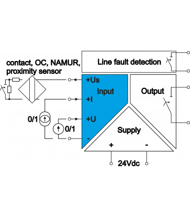 Bistate (binary) separator to operate with liquid level reflective sensor with line damage control, with intrinsically safe barrier Ex Atex, 1 channel