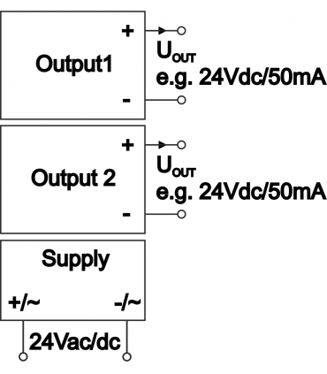 - 24VDC / 100mA or 2 x 24VDC / 50mA.