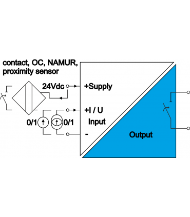 - Proximity sensor, NAMUR standard, closing non-potential contact, transistor switch NPN, PNP OC, current or voltage signals.