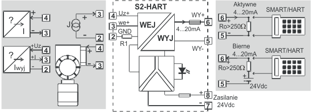 Jeśli wyjście aktywne trafi na wejście aktywne to nastąpi konflikt źródeł zasilania i sygnał 4...20 mA będzie nieprawidłowy, a nawet może dojść do uszkodzenia wejścia lub wyjścia.