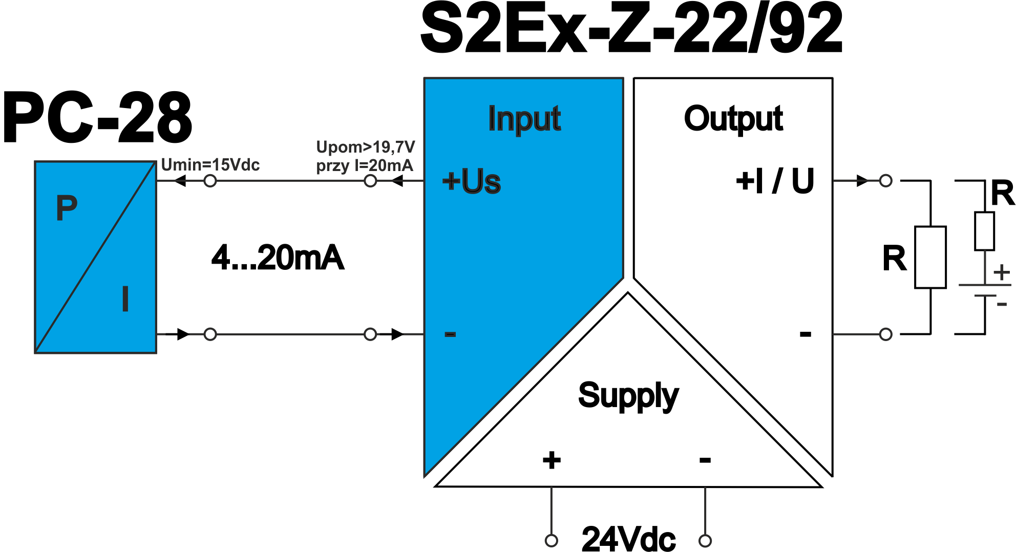 W tym przypadku należy zastosować separator typu S2Ex-Z w wykonaniu S2Ex-Z-22/92 (wybór tego wykonania spowodowany jest wymaganiami ATEX, które nie są omawiane w tym artykule). Wg karty katalogowej to wykonanie zapewnia napięcie pętli prądowej wynoszące przynajmniej 19,7 Vdc przy prądzie 20mA, więc wymagane minimalne napięcie pętli prądowej 4...20 mA jest spełnione.