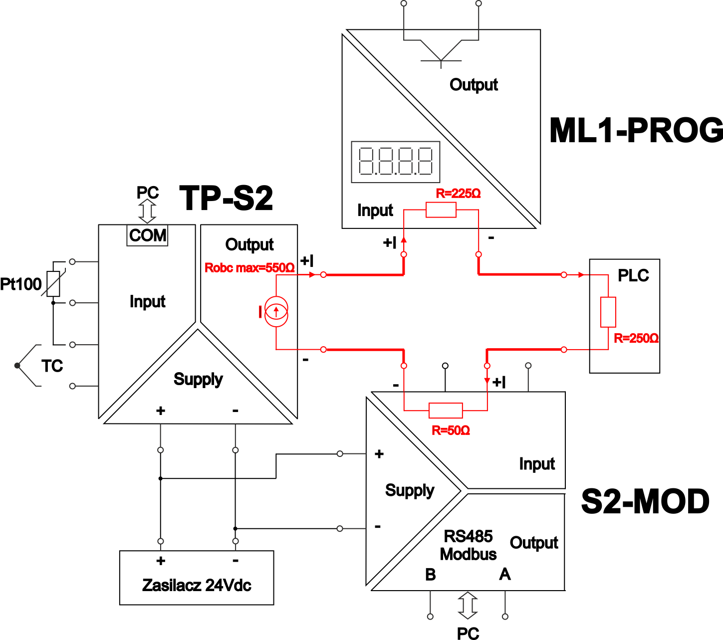 Pozostał zapas 550Ω-250Ω-225Ω=75Ω, można się więc pokusić o włączenie w szereg jeszcze wejścia konwertera S2-MOD (ponieważ jest rezystancja wejścia prądowego wynosi 50Ω) co umożliwi odczytanie mierzonej temperatury za pomocą transmisji RS485 Modbus.
