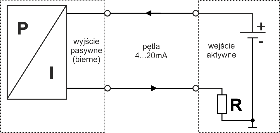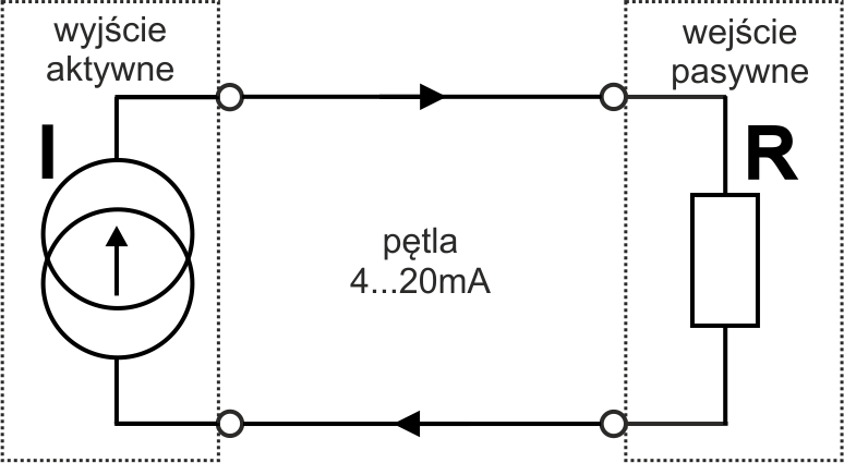 To czy wejście/wyjście 4...20 mA jest aktywne czy pasywne (bierne) informuje nas o tym, skąd pochodzi zasilanie pętli prądowej.