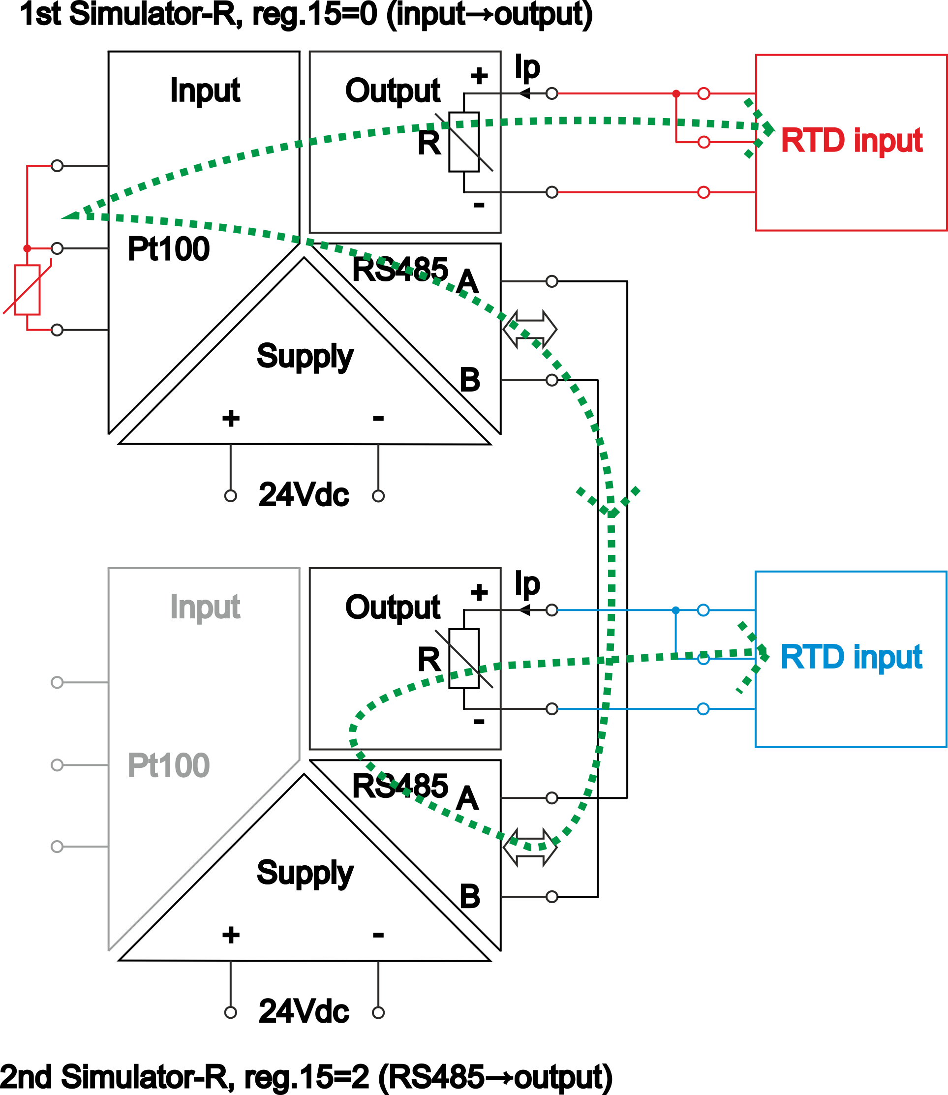 Należy w ten stary istniejący obwód wciąć się szeregowo jednym symulatorem rezystancji. Do jego wejścia podłączyć czujnik Pt100 i na swoim wyjściu zrealizuje on 1:1 taką samą rezystancję zapewniając poprawne działanie starego sterownika. Drugi symulator nalezy podłączyć z pierwszym za pomocą linii RS485. W drugim symulatorze ustawić kontrolę symulowanego wyjścia nie na podstawie sygnału wejściowego, lecz na podstawie wartości odczytanych z odpowiedniego rejestru pierwszego symulatora przez Modbus RTU. Dzięki temu otrzymamy drugie odseparowane wyjście symulujące Pt100 dokładnie w ten sam sposób.
