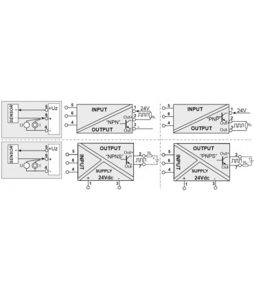 - Wyjście PNP, NPN (OC) lub dwustanowe (np. 0/24V) o częstotliwość zgodnej z podziałem wybranym przełącznikami.