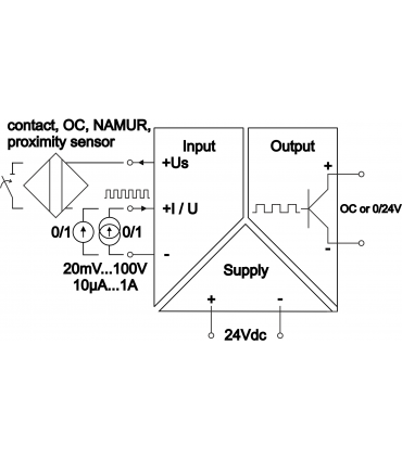 - Liniowe przetwarzanie na częstotliwość ciągu impulsów np. 0/24VDC lub NAMUR z czujników zbliżeniowych.