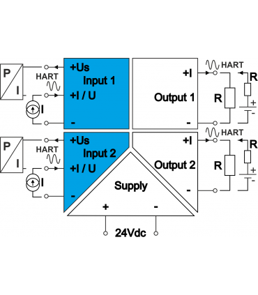 Zasilacz-separator sygnału dla przetworników dwuprzewodowych 4...20mA z transmisją HART, wyjście aktywne lub bierne, 2 tory