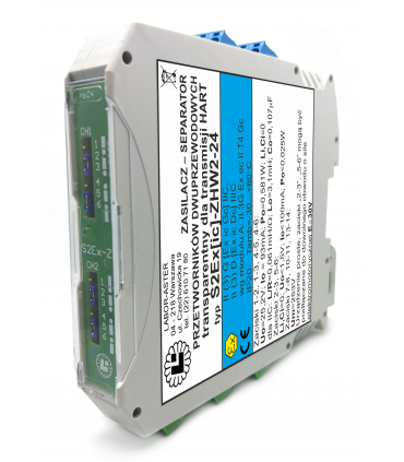 Zasilacz-separator sygnału 4...20mA dla przetworników dwuprzewodowych, wyjście aktywne lub bierne, 2 tory, bariera iskrobezpieczna Ex Atex