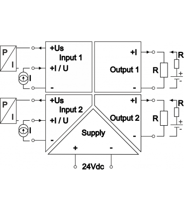 Powielacz-zasilacz-separator sygnału 4...20mA dla przetworników dwuprzewodowych, wyjście aktywne lub bierne, 2 wyjścia