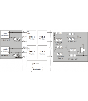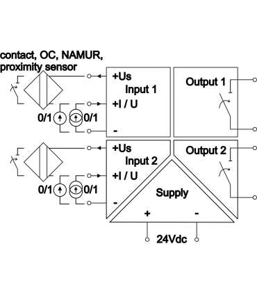 - Zasilanie pomocnicze dla czujnika zbliżeniowego, styk lub klucz tranzystorowy, czujnik Halla do komparacji prądu, napięcie lub prąd z histerezą.