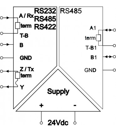 - Zwolnienie linii RS485 po 3 bodach. Dostosowany do współpracy z odbiornikami nie zachowującymi przerwy (narzuconej przez standard Modbus RTU) między zapytaniem a odpowiedzią.