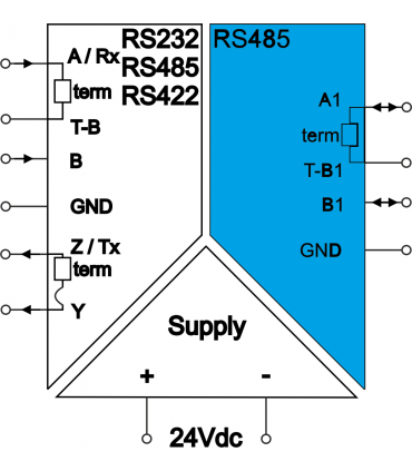 - Zwolnienie linii RS485 po 3 bodach. Dostosowany do współpracy z odbiornikami nie zachowującymi przerwy (narzuconej przez standard Modbus RTU) między zapytaniem a odpowiedzią.