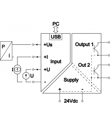 Uniwersalny przetwornik dowolnego sygnału standardowego na częstotliwość impulsów, wypełnienie PWM, z funkcją sygnalizatora granicznego, 2 wyjścia, programowalny przez USB