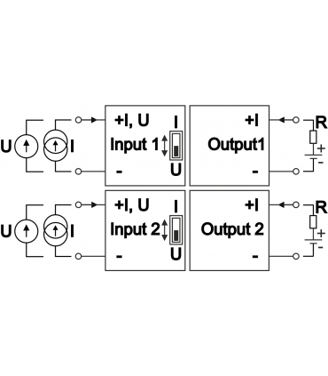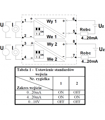 Dwuprzewodowy powielacz-separator sygnałów 4...20mA z wejściem uniwersalnym ustawianym przełącznikiem, 2 wyjścia