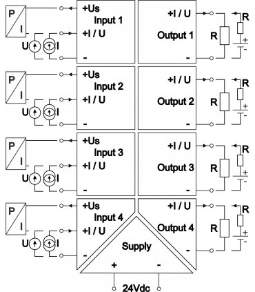 Powielacz-separator analogowy z opcją podłączenia przetwornika dwuprzewodowego oraz z opcją wyjścia biernego, 4 tory